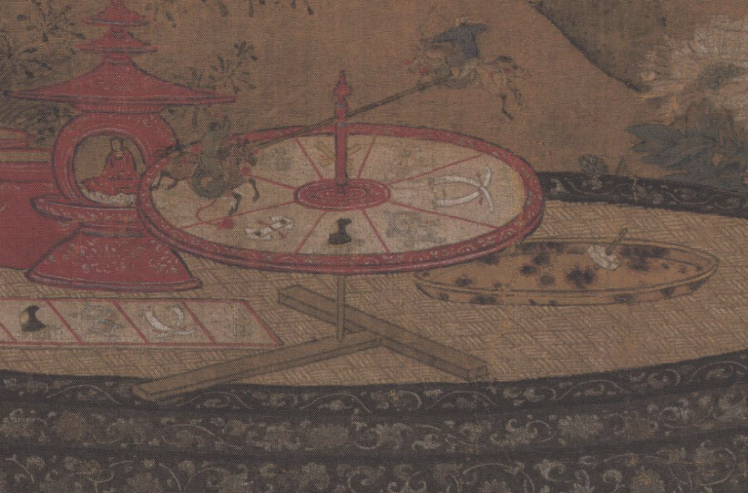 《秋庭戲嬰圖》中的圓凳上,就有一個(ge) 供兒(er) 童玩耍的“人馬轉輪”,類似於(yu) 市場上用於(yu) 關(guan) 撲的轉盤。它由一個(ge) 支架、一張轉盤和一根人馬造型的指針構成。撥動轉盤,當它停下來時,上麵的人馬指針就會(hui) 指向不同的圖案。