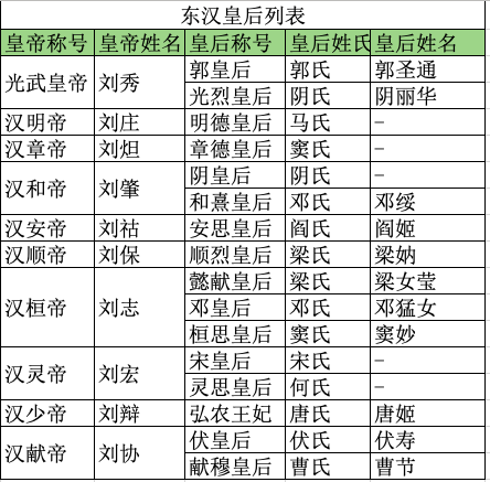 · 東(dong) 漢皇後列表,不包括被子孫追諡的皇後 / 表格信息來自《後漢書(shu) ·皇後紀》日複一日,到明帝之時,已有「四姓小侯」之說,即樊、郭、陰、馬四個(ge) 盛產(chan) 皇後家族中的男丁可以成為(wei) 「小侯」,依例可以入學、拜官、參與(yu) 朝會(hui) 。這些小侯不被視作為(wei) 「外戚」,相反,在漢代,他們(men) 被視作宗室的一員,外戚也是肺腑、骨肉。