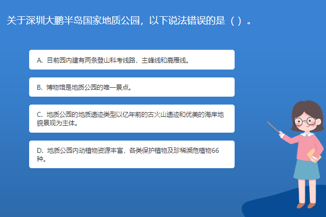 科普基地星空体育官网入口网站問答:關於深圳大鵬半島國家地質公園,以下說法錯誤的是( )。
