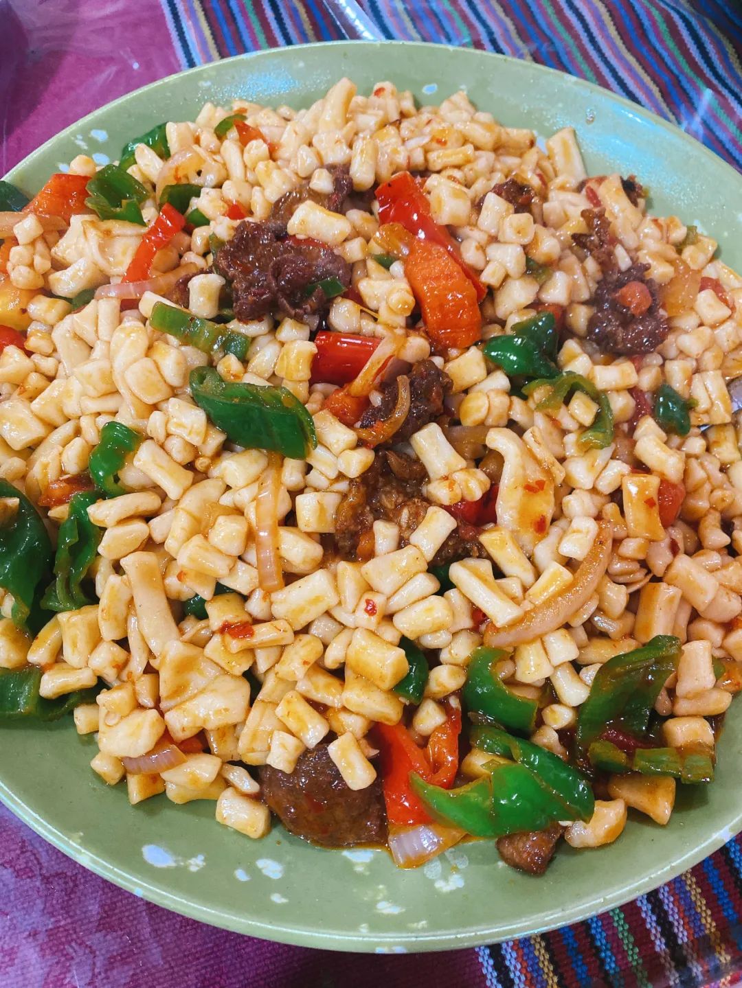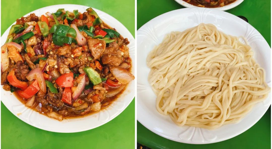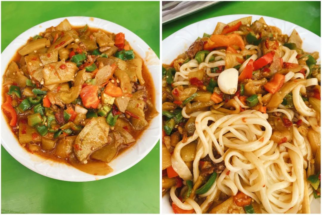 根據拌的配菜。拌麵又能分為(wei) 過油肉拌麵、碎肉拌麵、辣皮子拌麵、野蘑菇拌麵、茄子肉拌麵、毛白菜拌麵、酸辣土豆絲(si) 拌麵……過油肉拌麵,是最有名、信徒最多的。“過油肉”原出自山西,菜以油傳(chuan) 熱,因過油而名。後來流傳(chuan) 到其他地方時,也入鄉(xiang) 隨俗發展出多種做法。新疆的過油肉,羊肉揉入澱粉過油,再下西紅柿、青椒、洋蔥(新疆人稱皮牙子)炒製而成。