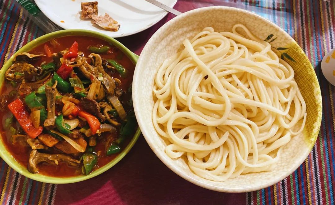 湯飯的做法類似於(yu) 河南的燴麵。羊肉、胡蘿卜、土豆、野蘑菇、西紅柿、幹辣椒皮、青菜做成燴菜湯;軟硬適中的麵團擀成稍薄的麵皮,刀切成拇指寬的條狀,手捉住麵的一頭一搓一揪,麵片順勢飛入鍋裏。看熟練的主婦揪片子是一種享受,就像偉(wei) 大的劍客拔劍後從(cong) 不回頭。