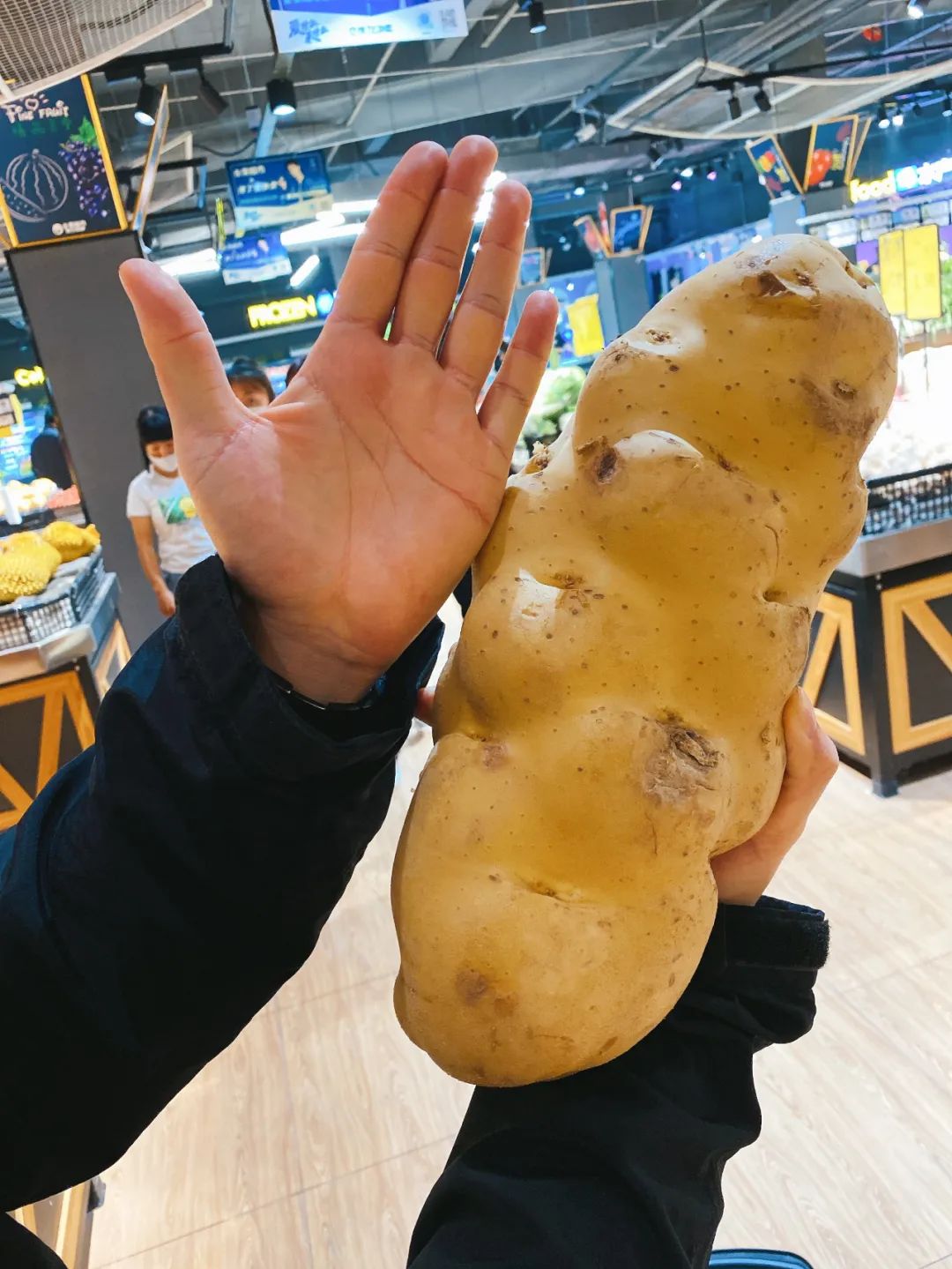 大盤雞也應該是移民落地、飲食文化交融的產(chan) 物。塔城地區沙灣縣素有“正宗大盤雞”的說法,據說當時許多新疆跑長途運輸的大貨車司機會(hui) 在沙灣歇腳,為(wei) 了滿足他們(men) 的飲食需求,大盤雞這種有肉有菜有主食的大分量食物應運而生。沙灣本土作家方如果在《大盤雞正傳(chuan) 》裏介紹:“我的印象中,一次吃大盤雞是1991年。那時候在縣城西邊老商業(ye) 局附近,有一家叫‘滿朋閣’的餐館,雞炒得很得味,是用整隻雞大塊炒,盛在大約一尺的搪瓷盤裏端上來,油辣滑麻,一盤賣十五塊錢吧,吃的人很多,店家忙不過來,常常要等著的客人自己動手收拾吃剩下的桌子。”▲新疆超市裏的大土豆,很多人最愛吃大盤雞拌麵裏的土豆 圖/三個(ge) 料理人