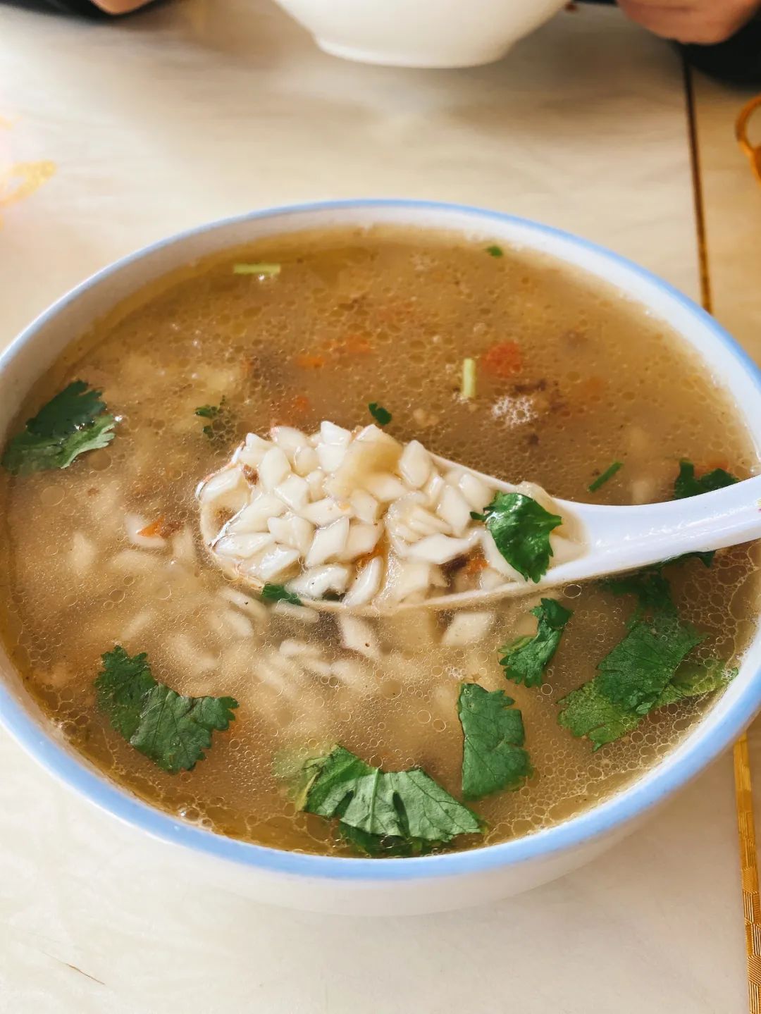 “曲曲”類似餛飩,餡以羊肉、洋蔥末為(wei) 主,湯是羊湯,所以很鮮,還會(hui) 放很多的薄荷葉。烤包子