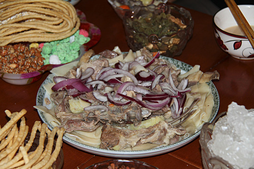 那仁是一種哈薩克傳(chuan) 統美食,有明顯的牧區特色。薄薄的寬麵煮熟後鋪在碟子裏,碼上皮牙子,澆上熱熱的馬肉湯,再鋪上馬肉/馬腸或者羊肉,就是那仁了。