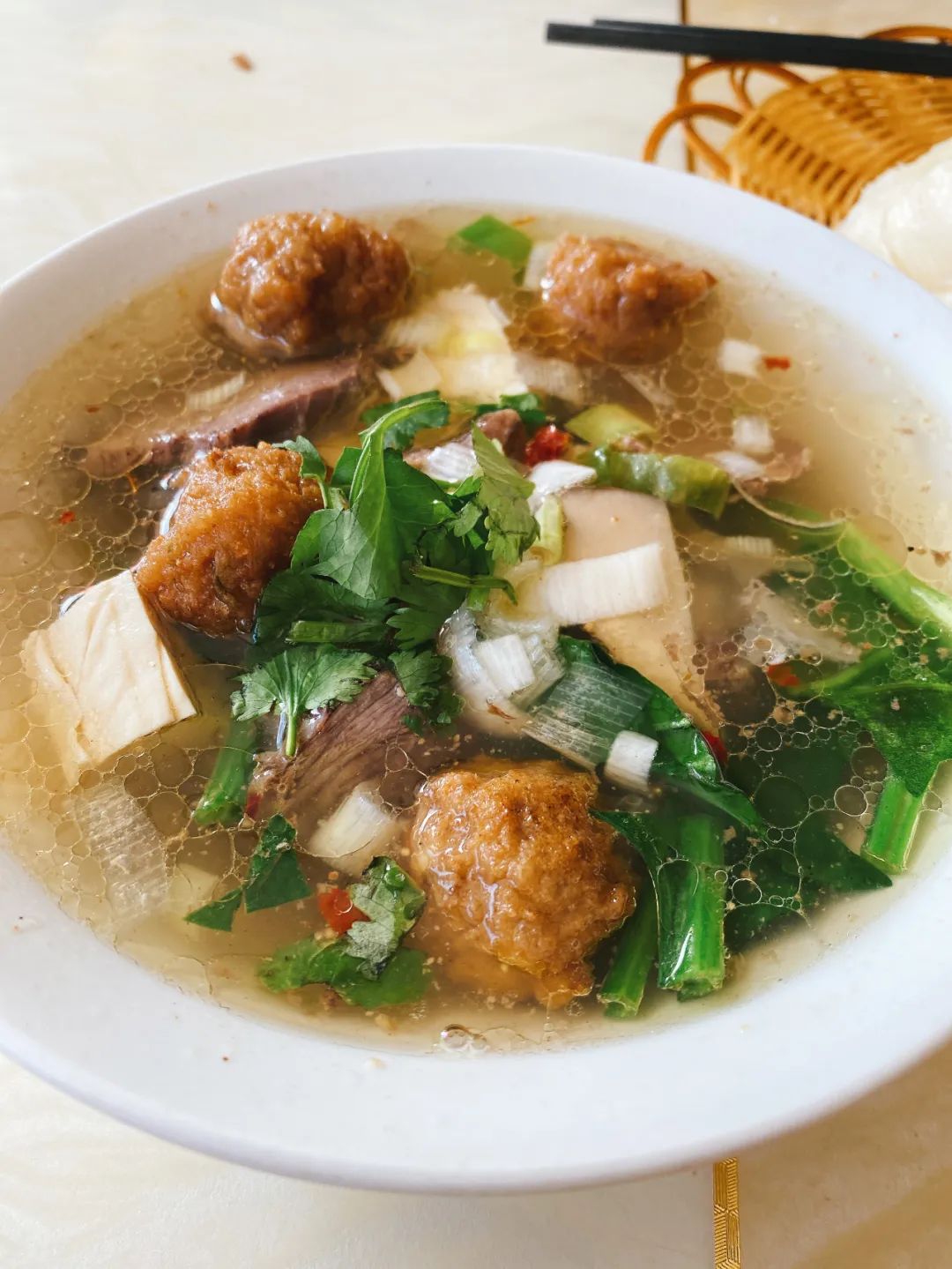 在新疆,油塔子和丸子湯是靈魂搭檔。丸子湯類似燴菜,由素丸子、牛肉/羊肉、豆腐片、洋蔥、粉條、涼粉、青菜燴成,油塔子掰碎吸飽湯汁,完全可當泡饃吃。薄皮包子