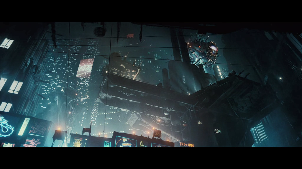 《銀翼殺手》建立了賽博朋克的美學標準:陰雨天,破舊、髒亂(luan) 、陰暗、狹窄的街道,高大密集的建築,朋克造型的人物,隨處可見的霓虹燈招牌,日本人和中國人開的商店,牆上的漢字塗鴉,空中穿梭的飛行汽車和打著探照燈的巨型飛艇,巨大屏幕上播放的日本廣告。