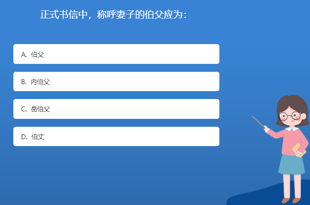科普星空体育官网入口网站問答:正式書信中,稱呼妻子的伯父應為: