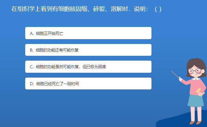 科普星空体育官网入口网站問答:在組織學上看到有細胞核固縮、碎裂、溶解時.說明:( )