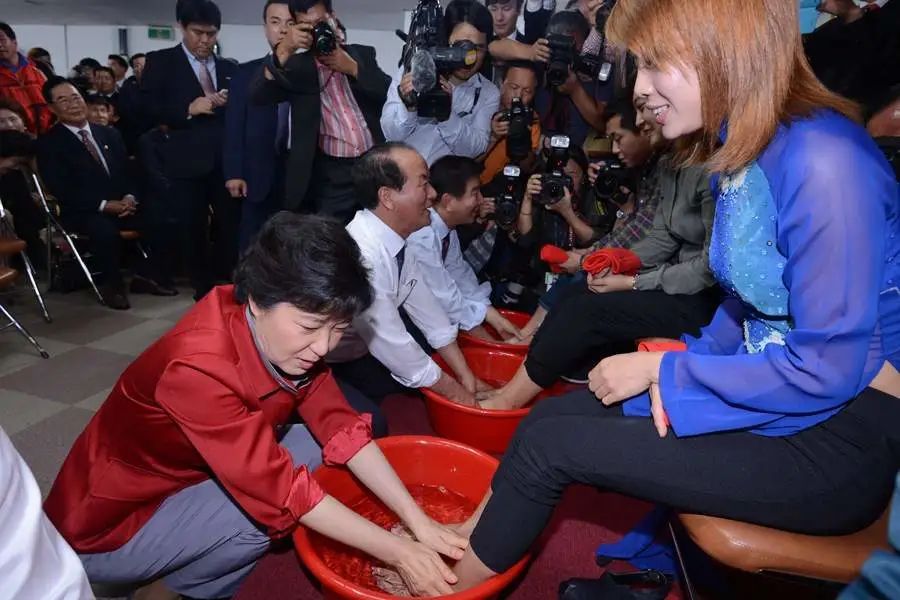 進入現代社會(hui) ,在無關(guan) 宗教的領域也能見到對「洗腳禮」的效仿。同時流行基督教和儒家思想的韓國就是個(ge) 有趣的例子:2012 年,樸瑾惠還是總統候選人時,就以為(wei) 市民洗腳的方式表達自己的「服務意識」。