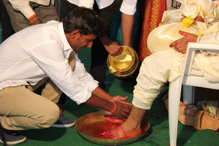 在印度,這樣的洗腳最常見於(yu) 婚禮:新娘的父母需要為(wei) 新郎洗腳,在有的地方也同時為(wei) 新娘洗腳,但負責洗腳的人一定是新娘的親(qin) 屬。