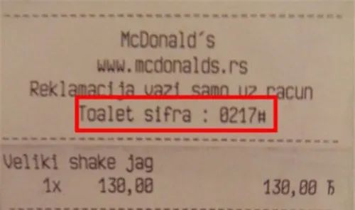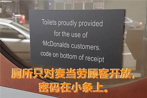 其二,店家不願外借。想用他們(men) 的廁所,就必須要先消費成為(wei) 他們(men) 的顧客。例如麥當勞,會(hui) 把店內(nei) 廁所門的密碼印在小票上。
