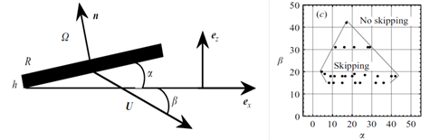 碟形石塊打水漂的力學模型及分析(左圖:α為(wei) 攻角,β為(wei) 入水彈道角;右圖:結果表明攻角為(wei) 20度時具有最佳的彈跳效果,而彈道角大於(yu) 45度後不會(hui) 再產(chan) 生彈跳)