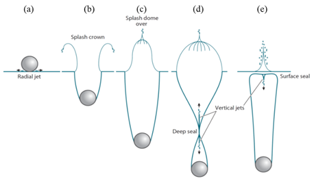 小球入水的典型過程(a:入水衝(chong) 擊和射流生成;b&c: 形成與(yu) 空氣連通的開式空泡和皇冠形飛濺;d: 空泡發生深閉合並形成垂向射流;e: 空泡發生表麵閉合)