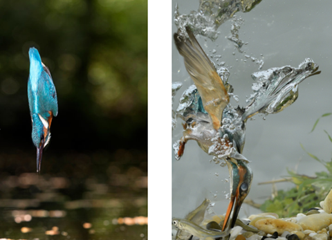 翠鳥入水過程照片(左圖:入水前空中姿態;右圖:入水後姿態控製及空泡形態)(圖片來源:veer圖庫)