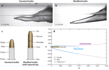 針對入水彈道穩定性的子彈形狀優(you) 化(a:常規子彈入水彈道失穩旋轉;b:優(you) 化後子彈形狀彈道保持穩定;c:子彈形狀對比;d:優(you) 化子彈入水空泡的理論與(yu) 實驗分析)