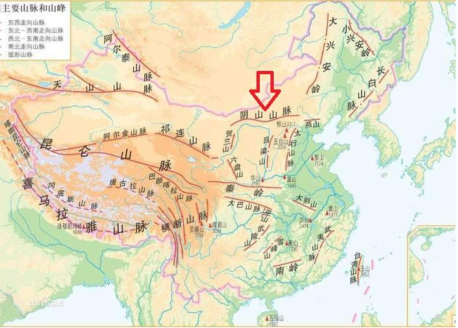 我國主要山脈和山峰地圖,東(dong) 西走向的陰山山脈橫亙(gen) 在正北方