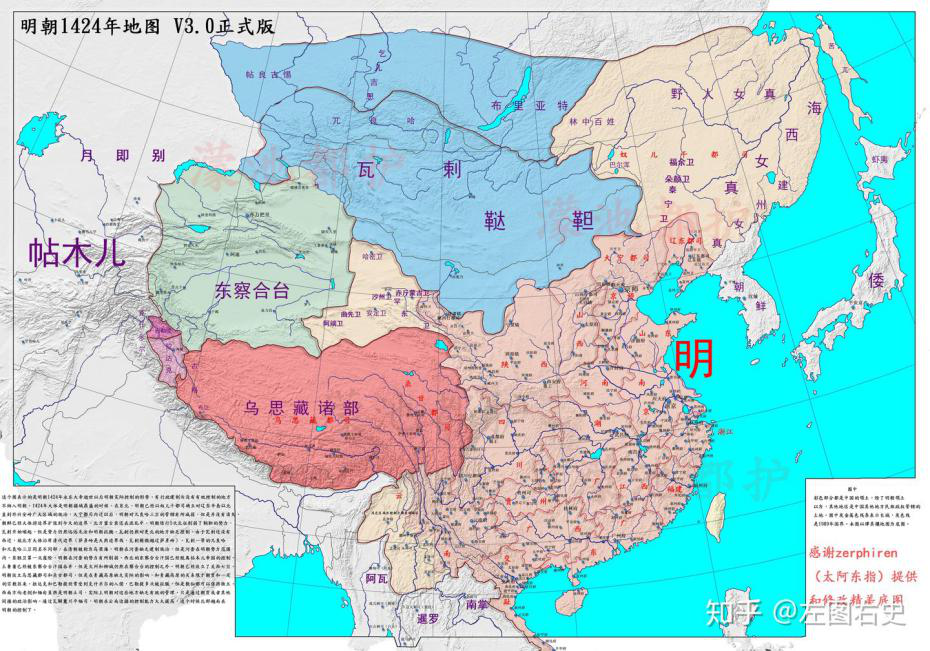 公元1424年明朝疆域圖(圖片來源:知乎@左圖右史)