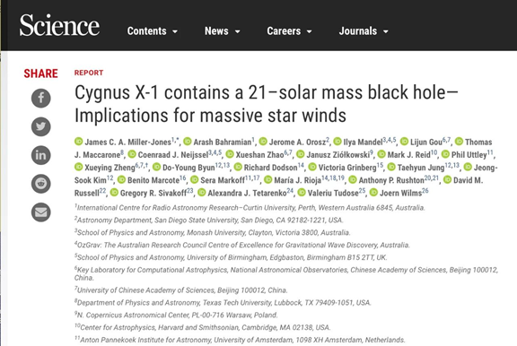 北京時間2月19日淩晨,三篇論文分別在國際頂級學術期刊《科學》(Science)和《天體(ti) 物理學報》(Astrophysical Journal)上發表,來自於(yu) 澳大利亞(ya) 、美國和中國的科學家們(men) 聯合發布了對黑洞X射線雙星天鵝座X1(CygnusX-1)的最新研究結果。