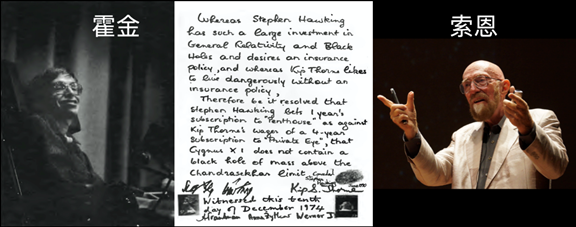 但是在隨後的十多年裏,對於(yu) 天鵝座X1的本質——究竟致密天體(ti) 是黑洞還是中子星,天文學家們(men) 一直眾(zhong) 說紛紜。20世紀70年代的時候,作為(wei) 黑洞研究的知名物理學家霍金和索恩甚至為(wei) 此而打賭立下了字據,霍金認為(wei) 應該是中子星,而索恩認為(wei) 是黑洞。到了上世紀90年代,越來越多的觀測證據表明,這個(ge) 係統中心應該是黑洞,霍金才簽字表示認賭服輸。