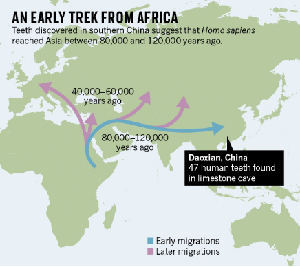 發現這47顆牙齒之後,提出的一種新的智人遷移假說,圖源Nature。