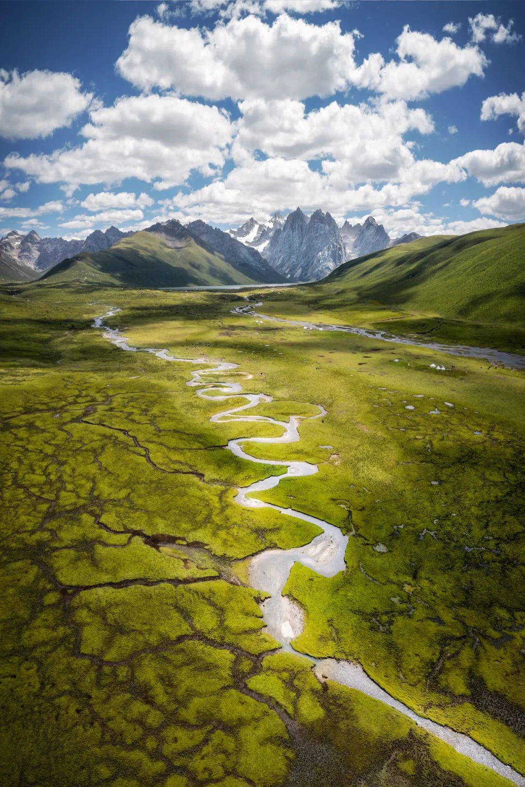 (巴顏喀拉山年保玉則峰紅土埡口,河流與(yu) 草地,攝影師@孫建鑫)▼