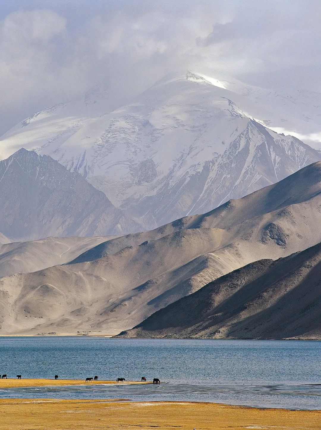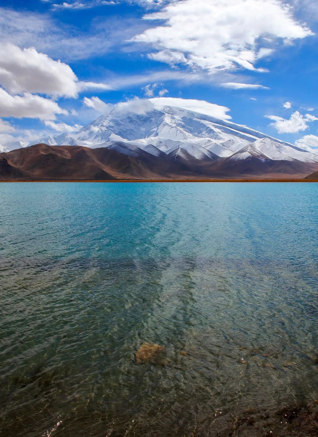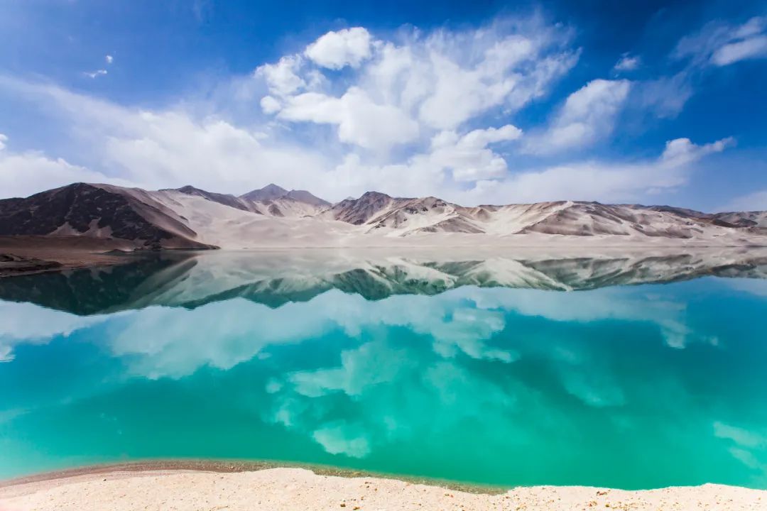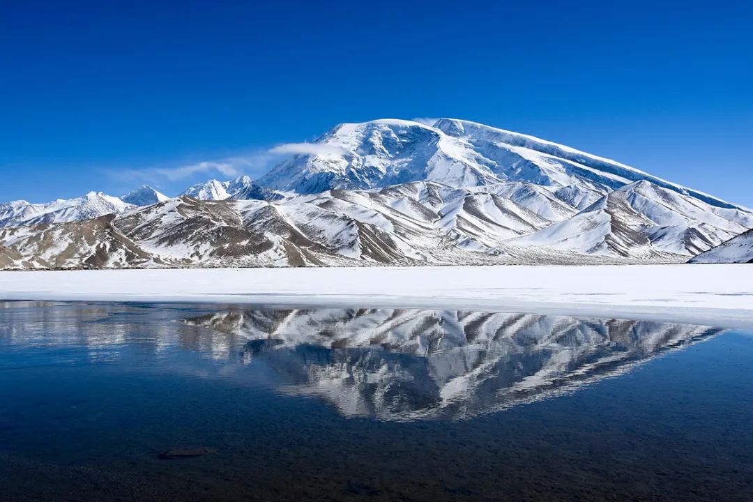 在山間的盆地、穀地中冰雪融水匯聚形成了眾(zhong) 多湖泊如慕士塔格腳下的喀拉庫勒湖(喀拉庫勒湖倒映著慕士塔格山的身影,攝影師@向文軍(jun) )