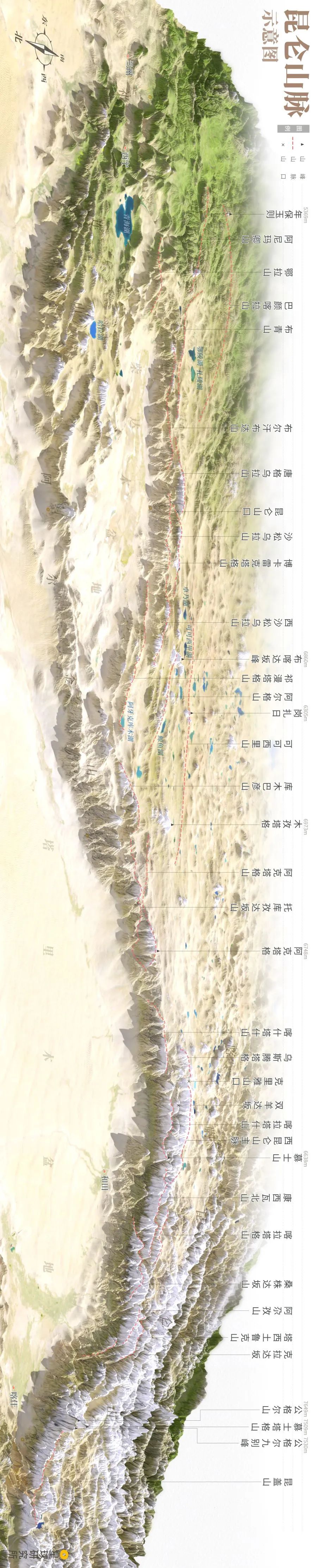 請將手機旋轉90°重新認識這座龐大的山脈這裏沒有神話隻有上古時代的蠻荒(請橫屏觀看,昆侖(lun) 山脈全圖,製圖@鞏向傑&趙榜/星球研究所)▼