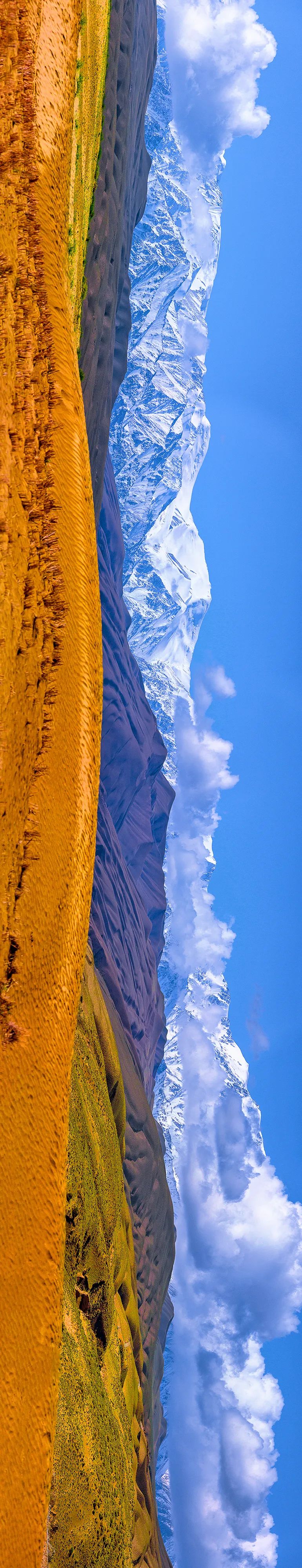 這裏在5億(yi) 年前曾是一片大洋來源不一的大陸塊體(ti) 相繼碰撞拚合先後形成了昆侖(lun) 山的不同區段受到印度板塊與(yu) 歐亞(ya) 板塊碰撞的影響在距今約400萬(wan) 年前地殼劇烈隆起、變形形成了今天我們(men) 看到的昆侖(lun) 山脈從(cong) 塔裏木盆地望去就像一堵高牆一般(請橫屏觀看,從(cong) 新疆和田策勒縣烏(wu) 魯克薩依鄉(xiang) 板藍根高山草甸遠望昆侖(lun) 群山,攝影師@尚昌平)▼