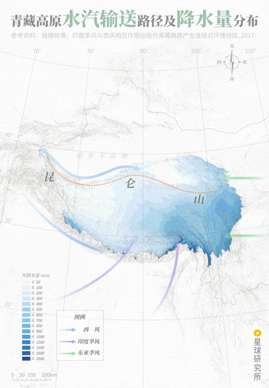 由於(yu) 高原的劇烈隆升阻擋了水汽的輸送昆侖(lun) 山成為(wei) 亞(ya) 洲內(nei) 陸最幹旱的地區之一來自東(dong) 邊的水汽到此已是鞭長莫及而來自西邊、南邊的水汽則難以逾越更加高聳的山脈和高原(青藏高原水汽輸送的路徑以及降水量分布,製圖@鞏向傑&趙榜/星球研究所)▼