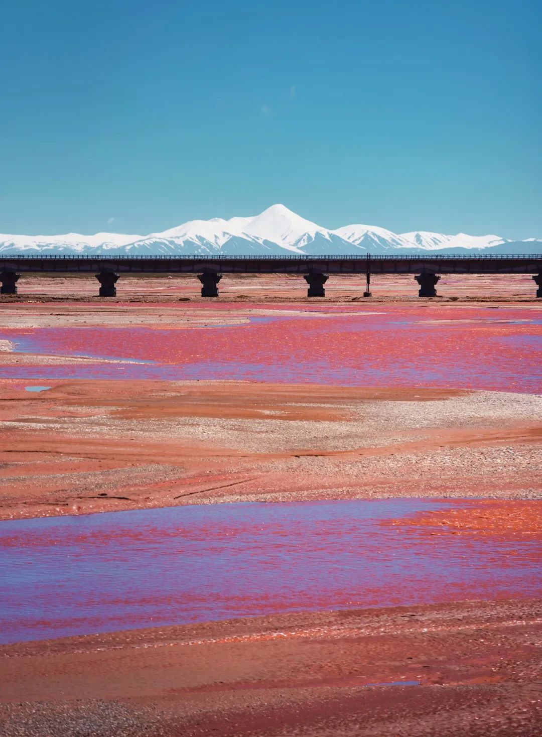 東(dong) 昆侖(lun) 山地勢相對平緩青藏公路和青藏鐵路都選擇從(cong) 這裏翻越昆侖(lun) 山(橫跨河道的青藏鐵路橋和遠處的玉珠峰,攝影師@夢旅人)