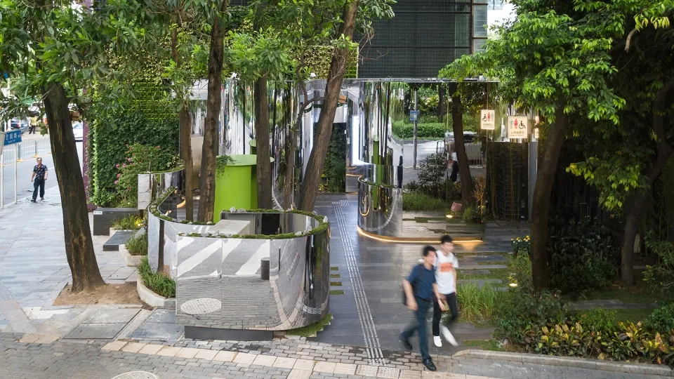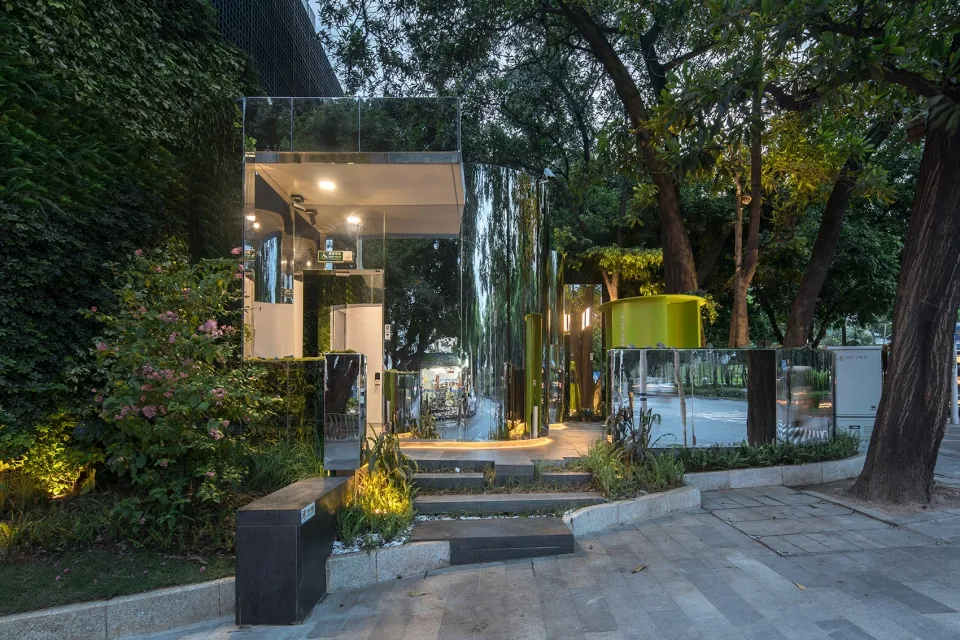 設計在立麵上采用8K鏡麵不鏽鋼材質,其外觀隨著光線的更替,四時的變化呈現出不同景象。建築與(yu) 周邊的景物交織在一起,既和諧地共存著,又似消隱於(yu) 樹林掩映中。當人們(men) 步入其中,其身影亦成為(wei) 了建築立麵的一部分,促成了一個(ge) 有生命的建築形態,建築在這瞬間成為(wei) 了一個(ge) 簡潔並有力的藝術裝置。
