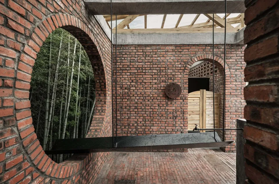 建築牆體(ti) 為(wei) 清水紅磚,屋麵采用木結構屋架和透明玻璃鋼瓦。抬高的木架在屋麵與(yu) 牆體(ti) 之間形成通透結構,滿足了廁所自然通風的需求。陽光穿過半透明的玻璃鋼瓦,使建築內(nei) 部獲得了充足的自然光線。