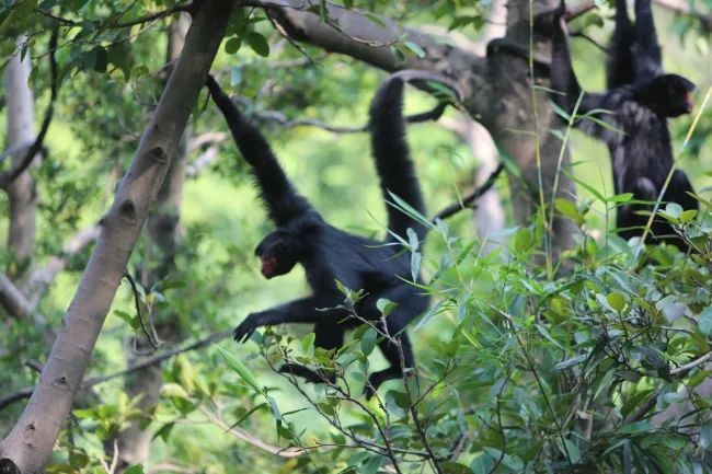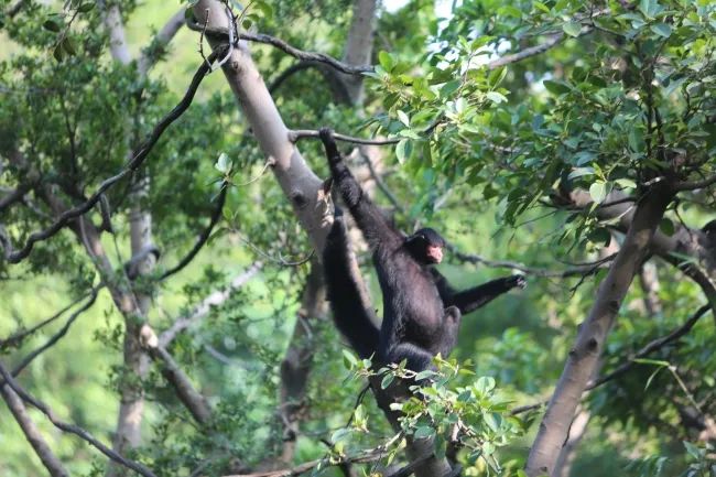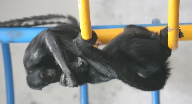 幼仔在3-4歲時性成熟,壽命一般在20年左右,最多可達27年以上。幼仔開始緊抱在雌性腹部,大約4個(ge) 月後便轉到雌性背上去了。(本文所有蜘蛛猴圖片,均為(wei) 作者拍攝)