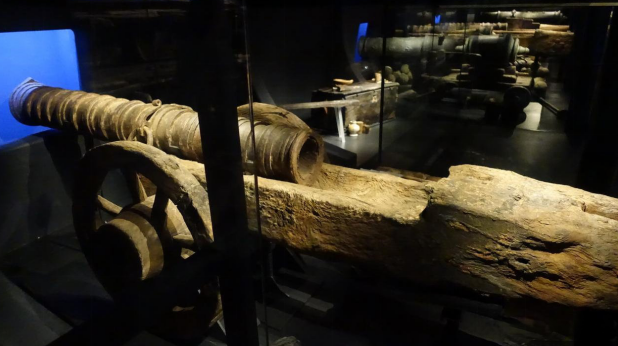 ▲“瑪麗(li) 羅斯”號上展出的另一門16世紀早期重型佛朗機,旁邊還有一門青銅製長炮,明代仿製後稱為(wei) “發熕”,但是這種火炮當時造價(jia) 昂貴,而且炮膛內(nei) 部的光滑程度也不比17-18世紀的重型佛朗機炮有優(you) 勢