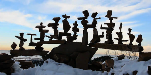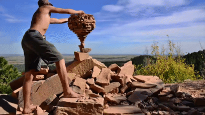 並不是人們(men) 大驚小怪,隻能說這些作品看著不太科學。這些石頭大小不一,卻能夠用一種看起來幾乎沒有接觸的方式相互支撐,然後不斷疊加: