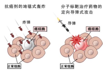 靶向藥就是在細胞分子水平上,針對已經明確的致癌位點設計的治療藥物。這個(ge) 位點可以精確到腫瘤細胞內(nei) 部一個(ge) 特殊的蛋白分子,也可以是一個(ge) 基因片段。根據這種位點,藥物進入人體(ti) 後就能與(yu) 特異的致癌位點結合發生作用,從(cong) 而讓腫瘤細胞特異性死亡,而不會(hui) 波及到腫瘤周圍的正常組織細胞,這種分子靶向治療藥物又被稱為(wei) “生物導彈”。