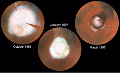 望遠鏡觀測到的火星北極極冠變化圖(圖片來源:美國亞(ya) 利桑那大學)
