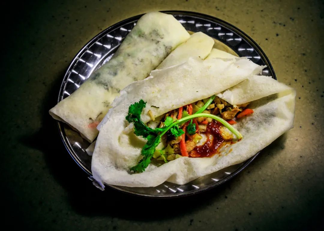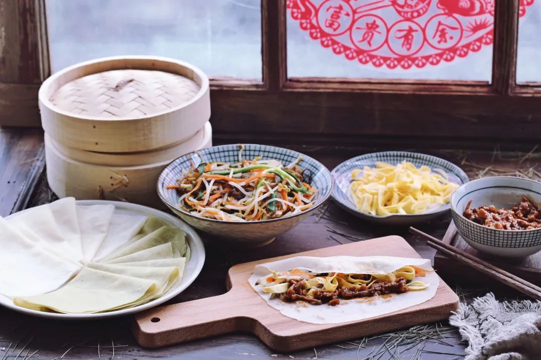 像龍須麵一樣廣泛地在“二月二”被當成節慶美食的還有春餅,又被叫做“吃龍鱗”。在手掌上攤開一張春餅,夾上一些蔥絲(si) 、黃瓜絲(si) 、胡蘿卜絲(si) 等,沾上一點甜麵醬或黃豆醬,卷上鬆仁小肚、醬肘子、炒合菜、韭菜雞蛋、攤雞蛋、醬肉絲(si) 等等,十分豐(feng) 富。