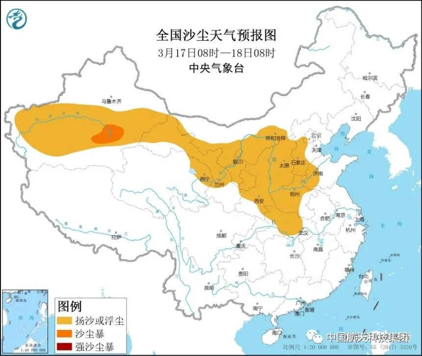 預計3月17日8時至18日8時新疆南疆盆地和東(dong) 部、內(nei) 蒙古西部、青海東(dong) 北部、甘肅、寧夏、陝西中北部、山西、河北中南部、山東(dong) 西部、河南中西部、湖北中西部等地的部分地區有揚沙或浮塵天氣