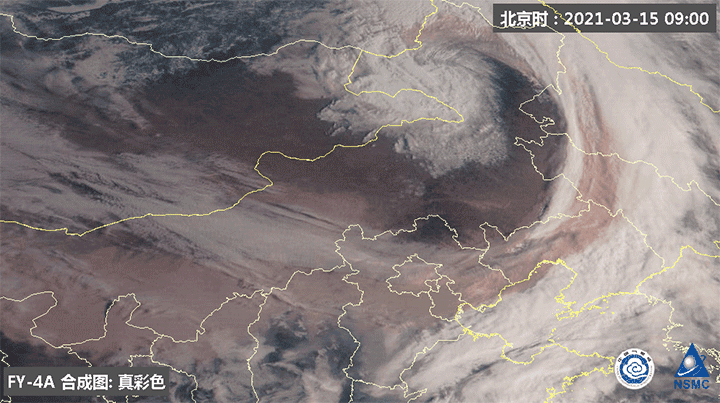 ▲ 風雲(yun) 四號A星監測影像(15日上午)。受鋒麵氣旋雲(yun) 係後部大風影響,自14日夜間起,內(nei) 蒙古、華北北部、東(dong) 北地區西部、西北地區東(dong) 部等地出現沙塵天氣