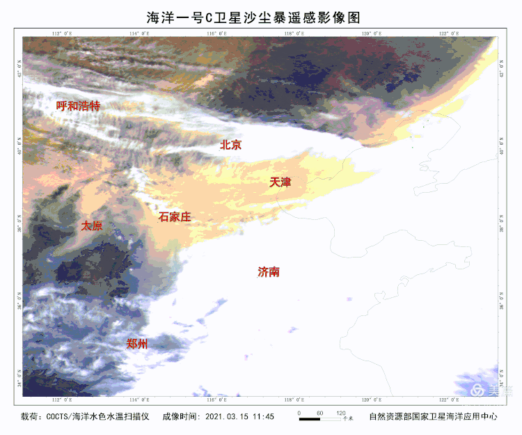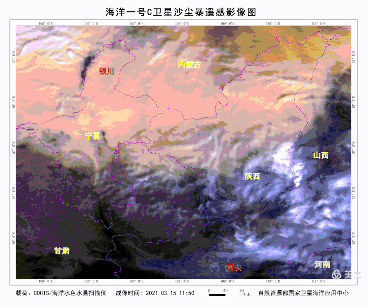 ▲ 風雲(yun) 四號A星監測影像(15日15時)。經估算,衛星可視的沙塵區麵積約為(wei) 83.9萬(wan) 平方公裏