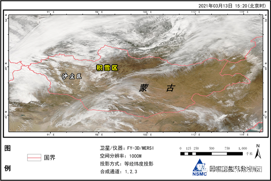 ▲ 13日下午的風雲(yun) 三號D星監測顯示:蒙古國西部有揚沙天氣出現,蒙古國中部有少量卷雲(yun) 覆蓋