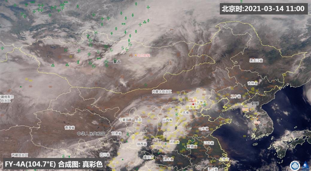 ▲ 14日至15日的風雲(yun) 四號A星影像顯示:14日,隨著蒙古氣旋的發展,蒙古國西部出現了較大範圍的沙塵暴天氣,同時該國東(dong) 部和南部出現了揚沙天氣,隨後,該國西部的沙塵暴影響範圍逐漸向東(dong) 南方向擴展,逐漸靠近我國邊境;15日,沙塵天氣影響我國北方地區