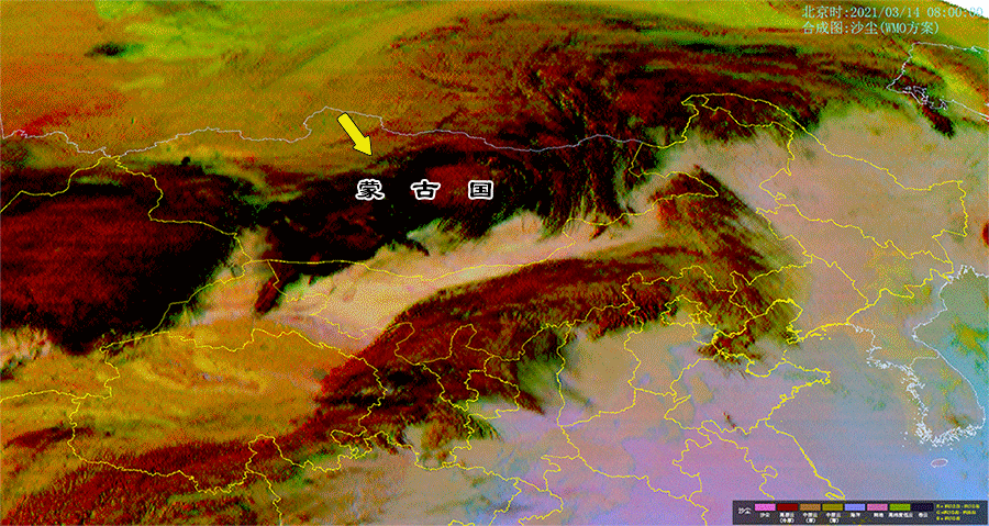 ▲ 通過風雲(yun) 四號A星沙塵合成動畫,可以看到粉紅色區域是沙塵,黃色箭頭所指為(wei) 沙塵的移動趨勢