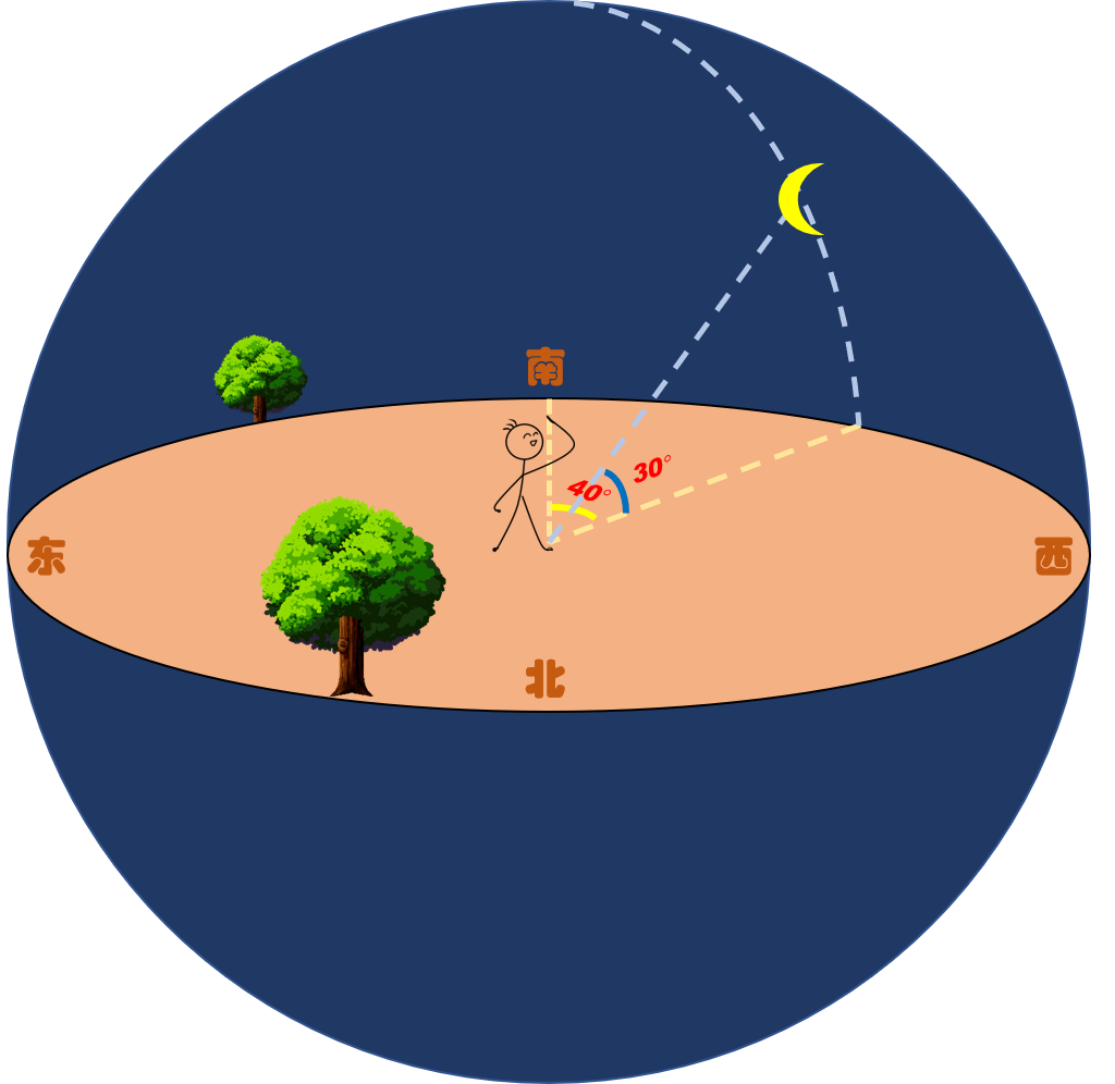 他長大後想成為一名宇航員,乘著火箭去找月亮。 高考那年,三毛同學報考了某校的天文係,他覺得自己離夢想越來越近了。可當他真正踏入這個專業的時候,才發現原來天文係的學生不是為當宇航員準備的。宇航員是從軍校的飛行員選拔的,而造上天的火箭的同學,學的是航天。而且,他終於明白了,月亮為什麽總是跟著他走。 在大一的《普通天文學》課上,三毛同學學到了天球坐標係的概念。此時的他明白了,“角度”這個東西,在天文學上異常重要。 老師在課上說道:“當你仰望星空的時候,夜空仿佛一個倒扣在大地上的半球型的碗,因而被叫做“天球”。假如你站在一片空曠的大地上,你想記錄下此時此刻月亮在天上的位置,以此來調整自己的望遠鏡指向,對準它仔細欣賞。一個簡單的辦法是使用“地平坐標係”。我們可以首先眼睛平視、麵朝正南方。以正南方為起點,朝正西方慢慢旋轉自己的身子,直到自己的眼睛所看的方向與月亮所在的方向一致。此時,你由南朝西轉動的角度便是月亮的“方位角”。你的視線此時還是與大地平行的,然後你再緩緩抬頭,直到眼睛對準了月亮,你抬頭的角度便是月亮的高度角。” 比如對於下圖的三毛同學來說,月亮的方位角為40度,高度角為30度。依靠這兩個角度,他便能很準確的調整自己的望遠鏡,指向月亮的位置。
