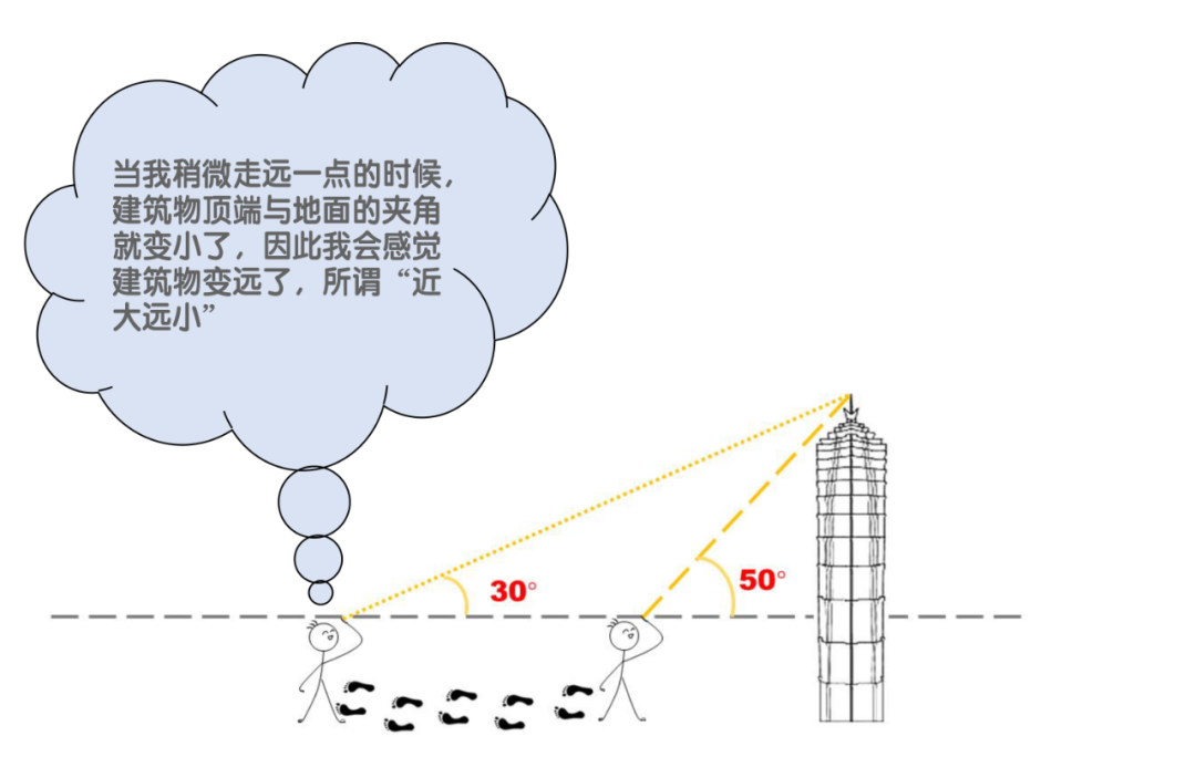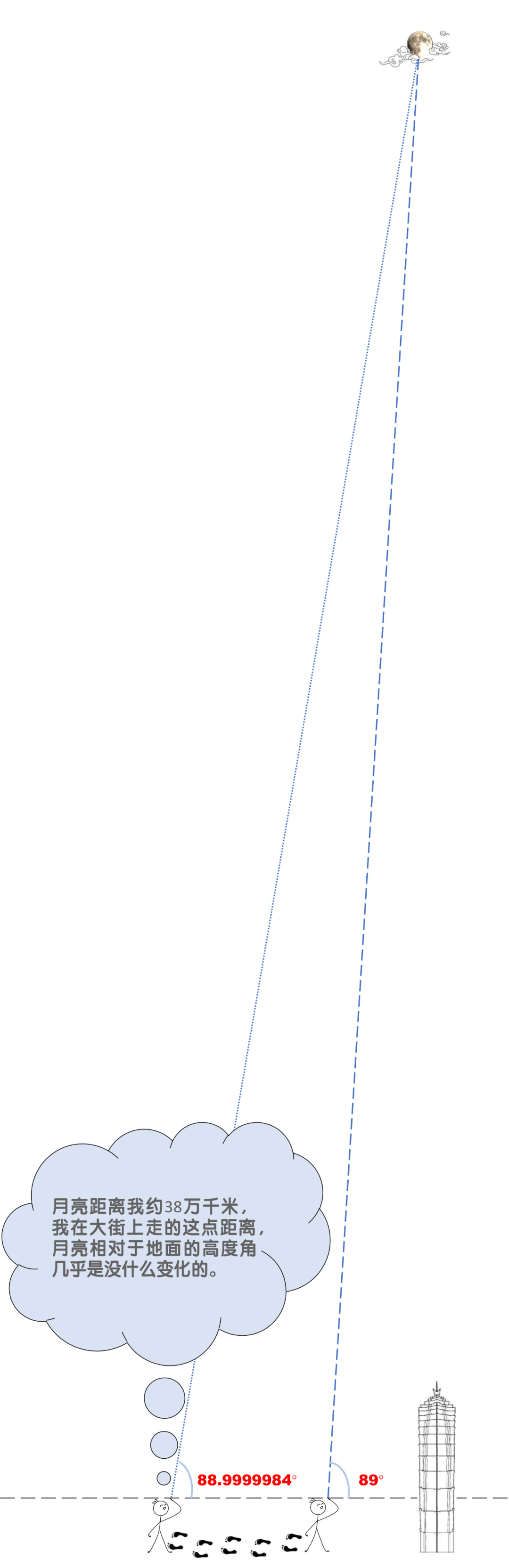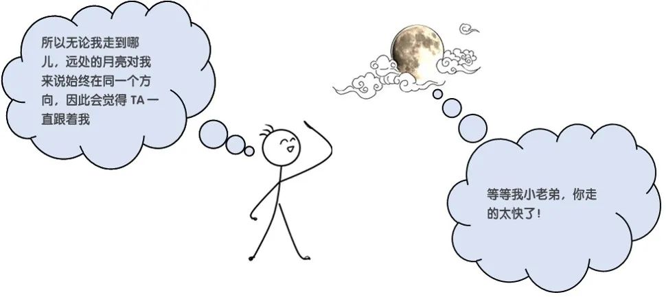 三毛同學在學過視差後,發現月亮跟著自己走的原因,也和視差有關。其實自己在移動的過程中,幾分鍾前的位置與幾分鍾後的位置也算是一個基線,月亮其實也會相對星空背景有細微的偏差,隻不過這個偏差實在太小了,以至於人眼無法察覺。然而,近處的建築物相對於月亮這一遙遠的背景卻有著很大的視差角,因而我們會感覺周圍的景物快速遠去,月亮卻始終跟著我們走。