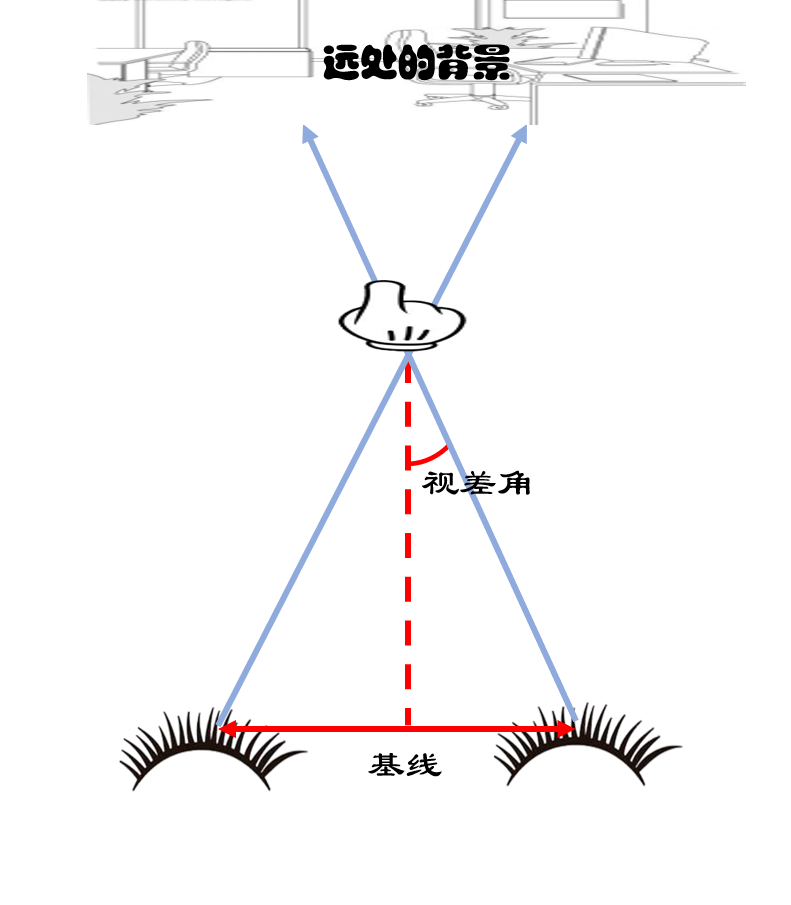 這個簡單易懂的現象,就叫做視差。若你把手指頭放遠一點,比如30厘米,你會發現視差變小了。因而通過視差,我們可以測量出手指距離我們腦袋的距離。隻需我們首先測量出兩個眼睛之間的距離,這個距離也可以叫做“基線”長度。再分別測量一下兩隻眼睛分別看向手指頭時,手指頭相對背景移動的角度“視差角”。通過角度和視差角以及簡單的幾何學(三角函數)星空体育官网入口网站,我們就可以測量出手指頭距離我們腦袋的距離了。
