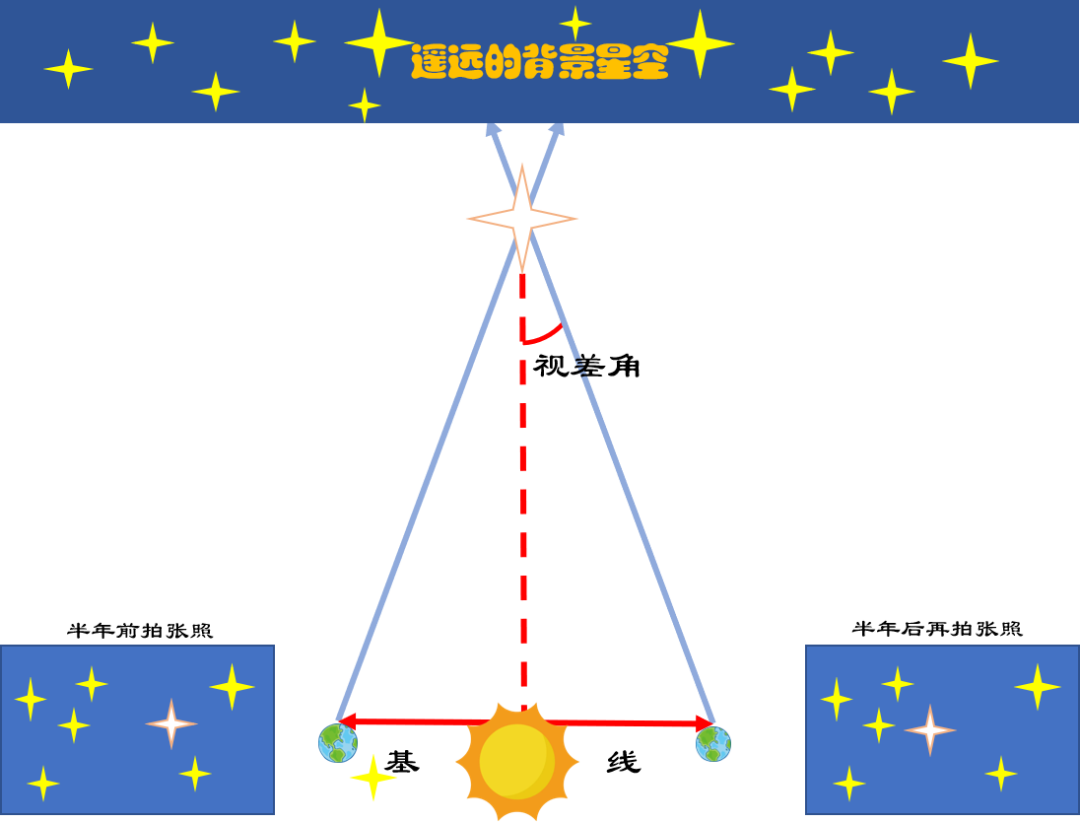 可是對於恒星這種比較遙遠的天體,用眼睛這點基線長度自然是不夠的,甚至用地球半徑這麽長的基線都很難測量出近鄰恒星相對遙遠背景恒星偏移的視差角。目前,天文學家所選擇的辦法是間隔一段時間(比如半年)對同一顆恒星拍照,由於地球繞著太陽公轉,因而半年前的地球與半年後的地球觀測同一顆恒星會存在視差,隻要測量出了這個視差角,結合日地距離,就能測量出這顆恒星的距離。三角視差法是天文學中最基本的測距方法,也是更遙遠天體距離測量的重要基礎。