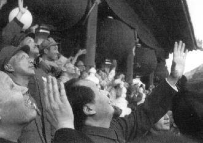 檢閱台上,毛澤東(dong) 等中央領導同誌仰視天空,興(xing) 奮地向空中招手。1949年10月1日,北京天安門廣場沸騰的人海上空,參加閱兵的飛機編隊呼嘯而過。