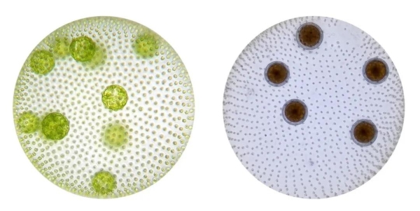新不倫瑞克大學的生物學家奧羅拉·內德爾庫所研究的團藻屬於多細胞藻類,會有目的地選擇有性生殖。這種藻類通常生活在無性的群體中(左圖),包含十幾個生殖細胞(germ cell,圖中綠色球體)。在壓力條件下,群落中出現了性(右圖),生殖細胞發生融合,變成抵抗力較強的孢子(圖中深紅色球體)。圖片來源:Aurora Nedelcu